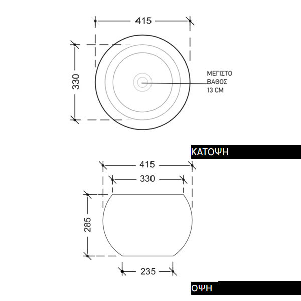 • Διαστάσεις (Μ x Π x Υ): Ø 41,5 x 28,5 cm
