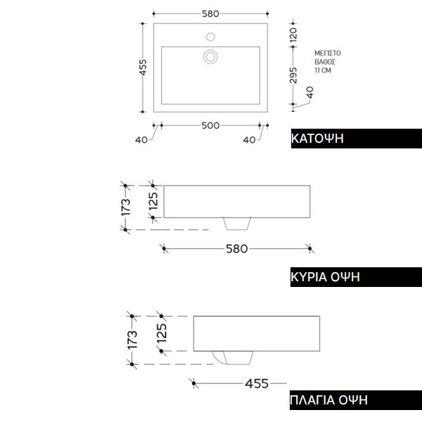 • Διαστάσεις (Μ x Π x Υ): 58 x 45,5 x 11/12,5 cm