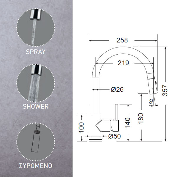 • Ρουξούνι περιστρεφόμενο με συρόμενο ντους διπλής ροής (shower/spray) και άθραυστο σπιράλ