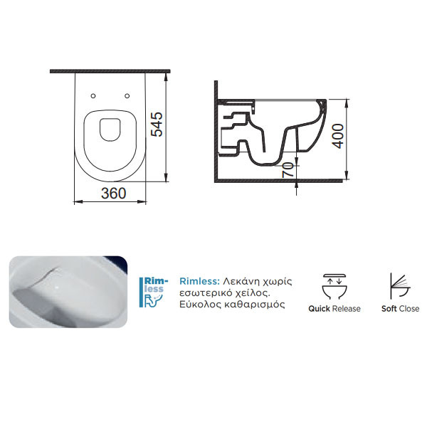 • Λεκάνη κρεμαστή κομπλέ rimless με κάλυμμα βακελίτη, αποσπώμενο soft close