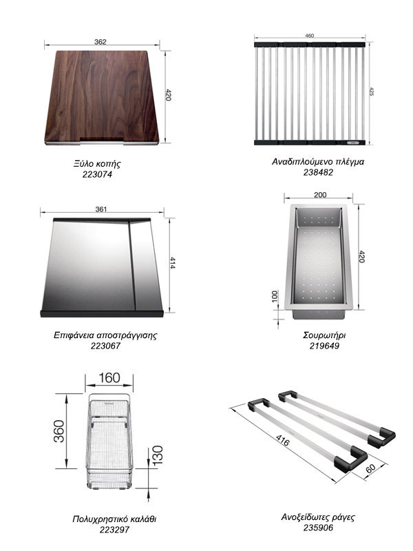 • Για το νεροχύτη Blanco Zerox 700-U Dark Steel διατίθενται προαιρετικά αξεσουάρ με επιλογή