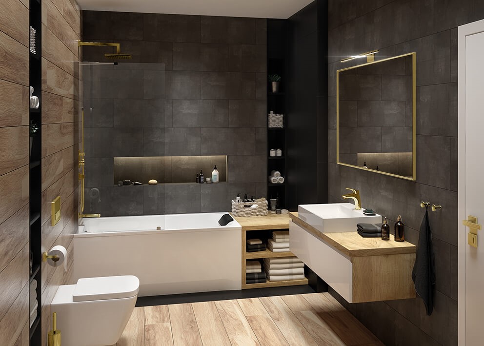 Η πολυτέλεια επιστρέφει δυναμικά με χρυσές και μαύρες λεπτομέρειες που αποπνέουν κομψότητα και διαχρονικό στυλ. Τα ματ μαύρα αξεσουάρ, όπως μπαταρίες νιπτήρα, ντουζιέρες και χειρολαβές, προσφέρουν έναν σύγχρονο χαρακτήρα, ενώ οι χρυσές πινελιές αποπνέουν πολυτέλεια χωρίς υπερβολές. Το 2025, οι πιο μοντέρνες μπανιέρες και νιπτήρες θα είναι διακοσμημένα με μεταλλικά στοιχεία που ενισχύουν την πολυτελή αίσθηση και το καθαρό design.