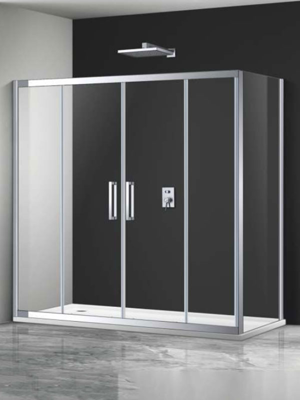 • Γωνιακή καμπίνα ασύμμετρης ντουζιέρας με δύο σταθερά φύλλα, δύο συρόμενες πόρτες και επιπλέον πλαϊνό σταθερό, σε χρώμιο