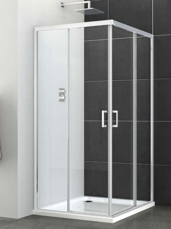 • Τετράγωνη καμπίνα γωνιακής τοποθέτησης βαρέως τύπου, με δύο σταθερά και δύο συρόμενες πόρτες, σε χρώμιο