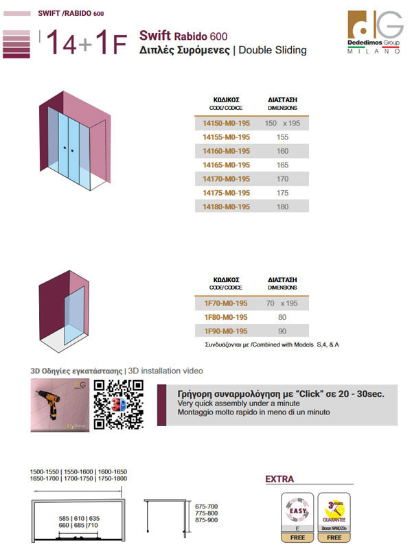 • Διαστάσεις: Πόρτα 150 έως 155 cm και πλαϊνό σταθερό 67,5 έως 70 Χ 195 cm