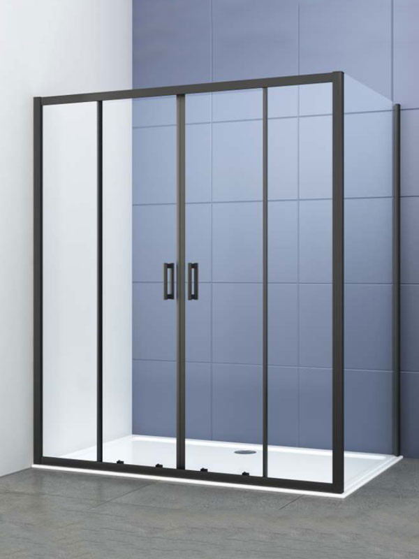 • Γωνιακή καμπίνα ασύμμετρης ντουζιέρας με δύο σταθερά φύλλα, δύο συρόμενες πόρτες και επιπλέον πλαϊνό σταθερό, σε μαύρο