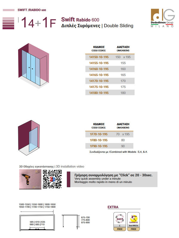 • Διαστάσεις: Πόρτα 150 έως 155 cm και πλαϊνό σταθερό 67,5 έως 70 Χ 195 cm