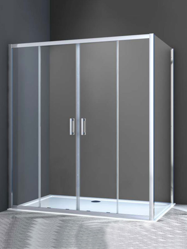 • Γωνιακή καμπίνα ασύμμετρης ντουζιέρας με δύο σταθερά φύλλα, δύο συρόμενες πόρτες και επιπλέον πλαϊνό σταθερό, σε χρώμιο