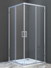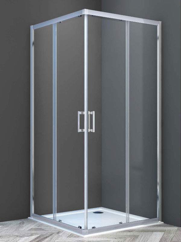 • Τετράγωνη καμπίνα γωνιακής τοποθέτησης βαρέως τύπου, με δύο σταθερά και δύο συρόμενες πόρτες, σε χρώμιο