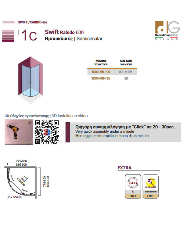 • Η καμπίνα Swift 1C Black προσφέρεται και σε διάσταση 88,5 Χ 88,5 Χ 195 cm