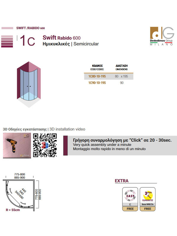 • Η καμπίνα Swift 1C προσφέρεται και σε διάσταση 88,5 Χ 88,5 Χ 195 cm