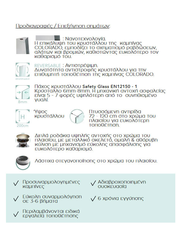 • Διάφανο κρύσταλλο ασφαλείας 6 mm με νανοτεχνολογία, προφίλ ανοδιωμένου αλουμινίου και ανοξείδωτη λαβή
