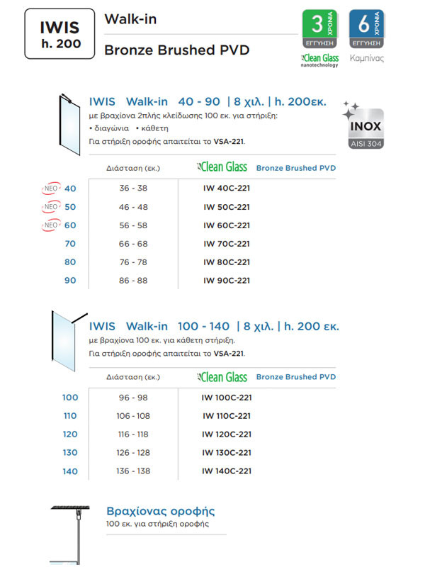 • Διάφανο κρύσταλλο ασφαλείας 8 mm Clean Glass, προφίλ ανοξείδωτο ΙΝΟΧ 304 και βραχίονα διαγώνιας ή κάθετης στήριξης με μέγιστη προβολή 100 cm (μειώνεται με κοπή του βραχίονα)