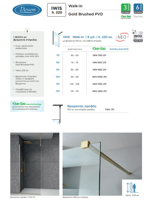 • Διάφανο κρύσταλλο ασφαλείας 8 mm Clean Glass, προφίλ ανοξείδωτο ΙΝΟΧ 304 και βραχίονα διαγώνιας ή κάθετης στήριξης με μέγιστη προβολή 100 cm (μειώνεται με κοπή του βραχίονα)
