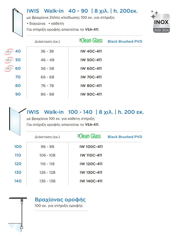• Διάφανο κρύσταλλο ασφαλείας 8 mm Clean Glass, προφίλ ανοξείδωτο ΙΝΟΧ 304 και βραχίονα διαγώνιας ή κάθετης στήριξης με μέγιστη προβολή 100 cm (μειώνεται με κοπή του βραχίονα)