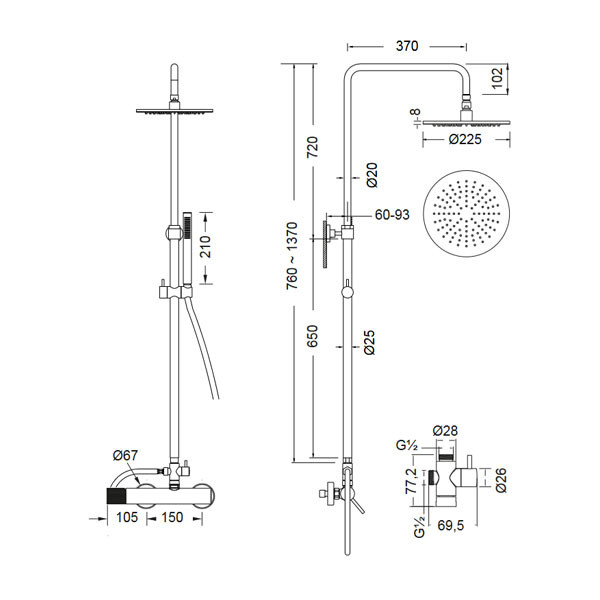 • Ανακλινόμενο ντους οροφής Ø 22,5 cm