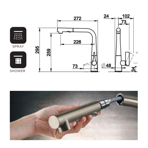 • Ρουξούνι περιστρεφόμενο με αποσπώμενο ντους διπλής ροής και άθραυστο σπιράλ