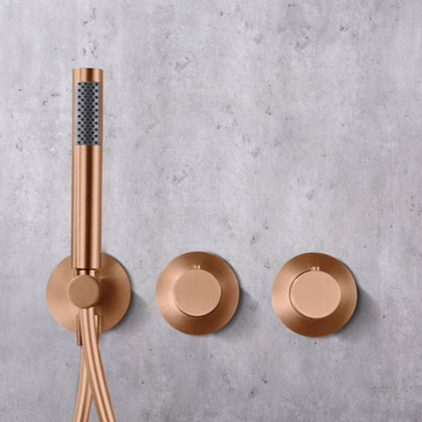 • Εντοιχιζόμενη μπαταρία ντους, κομπλέ με διπλό μίκτη σε ροζ χρυσό ματ / χαλκού, με επίστρωση PVD