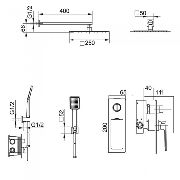 • Τετράγωνη ανακλινόμενη ντουζοκεφαλή ανοξείδωτη SS304 25 x 25 cm, επίπεδη Slim Design