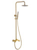 • Ρυθμιζόμενη τηλεσκοπική βέργα ντους 2 εκροών, ύψους 88 cm έως 124 cm από την στάθμη της μπαταρίας σε χρυσό ματ, με επίστρωση - βαφή PVD
