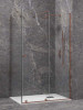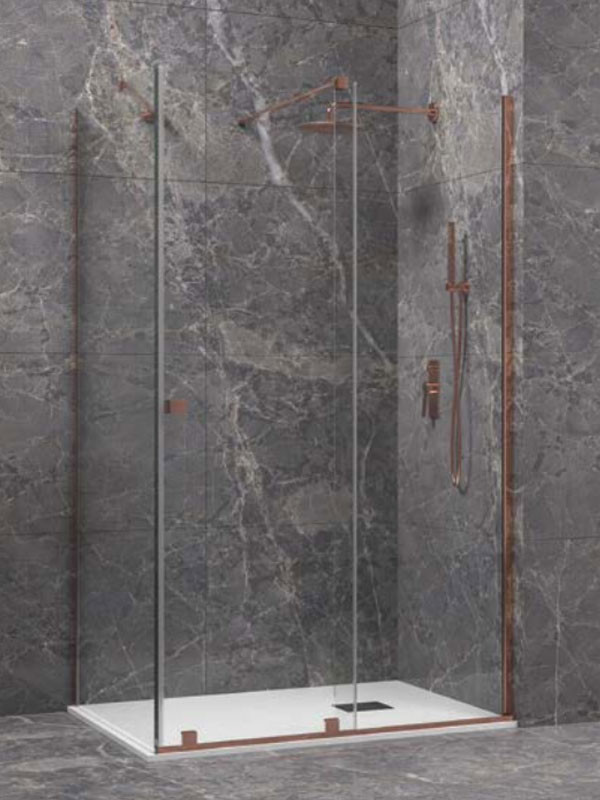 • Γωνιακή καμπίνα τετράγωνης ντουζιέρας βαρέως τύπου, ιδιαίτερα στιβαρής κατασκευής, με ένα σταθερό πλαίσιο, μια συρόμενη κρυστάλλινη πόρτα και επιπλέον πλαϊνό σταθερό, σε rose gold