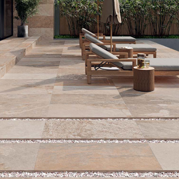 • Πλακάκι εξωτερικού δαπέδου, πορσελανάτο, rectificado, πολλαπλών τόνων με ματ, ανάγλυφη in / out επιφάνεια
