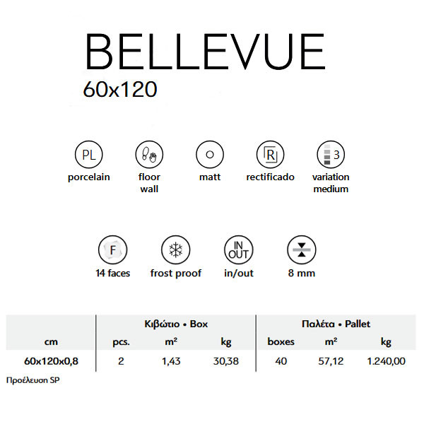 • Πλακάκι εσωτερικού δαπέδου πορσελανάτο, rectificado πολλαπλών τόνων με ματ επιφάνεια