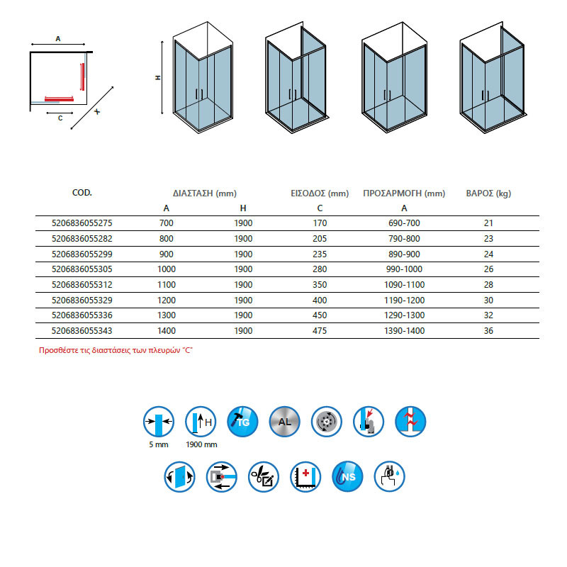• Ασύμμετρη καμπίνα γωνιακής τοποθέτησης, συρόμενη με δύο σταθερά φύλλα και δύο συρόμενες πόρτες