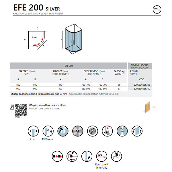 • Η καμπίνα EFE 200 Silver διατίθεται και σε διάσταση 88 x 88 x 190 cm με επιλογή