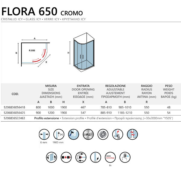 • Η καμπίνα Flora 650 Icy προσφέρεται και σε διάσταση 88,5 έως 91 Χ 118,5 έως 121 Χ 190 cm