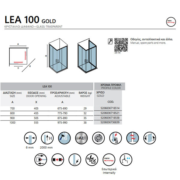 • Διατίθεται με προφίλ αλουμινίου σε χρυσό και κρύσταλλα tempered 6 mm διάφανα