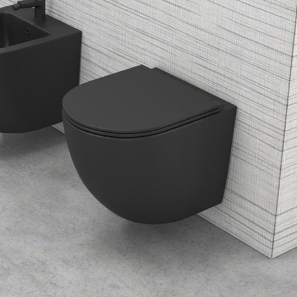 • Λεκάνη κρεμαστή μαύρη, κεντρικής έκπλυσης, με υδροστροβιλισμό και κάλυμμα σε μαύρο ματ