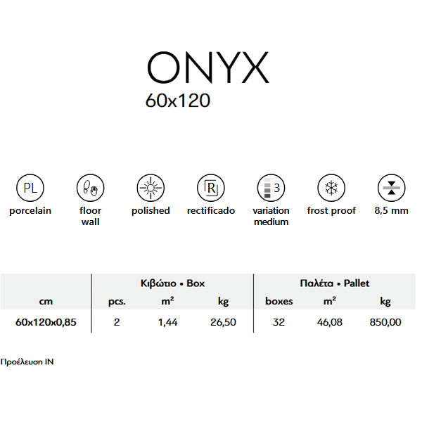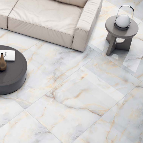 • Πλακάκι εσωτερικού δαπέδου πορσελανάτο, με full lapato γυαλιστερή επιφάνεια, rectificado, πολλαπλών τόνων