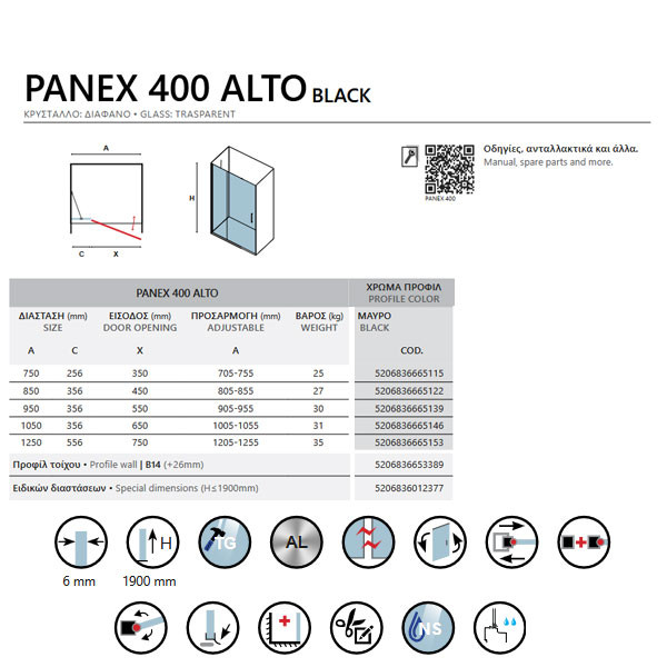 • Καμπίνα τοποθέτησης από τοίχο σε τοίχο ιδιαίτερα στιβαρής κατασκευής με ένα σταθερό πλαίσιο και μια ανοιγόμενη κρυστάλλινη πόρτα, σε μαύρο
