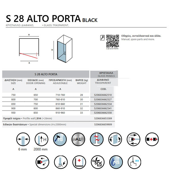 Karag S 28 Alto Porta Black Καμπίνα Ντουζιέρας Τοίχο - Τοίχο