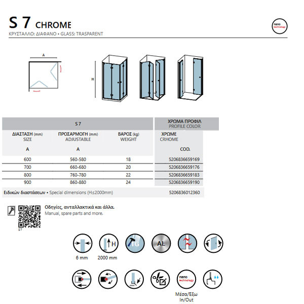 • Διατίθεται ετοιμοπαράδοτη σε προφίλ ανοδιωμένου αλουμινίου και σε κρύσταλλα διάφανα tempered 6 mm