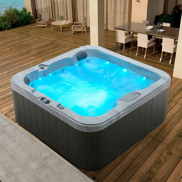 • Μπανιέρα spa υδρομασάζ με εσωτερικό χρώμα Α010 χωρητικότητας τεσσάρων έως πέντε ατόμων και περιμετρική ποδιά από συνθετικό ξύλο