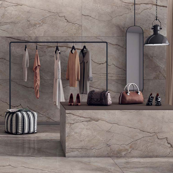 • Πλακάκι εσωτερικού δαπέδου πορσελανάτο, rectificado πολλαπλών τόνων με γυαλιστερή επιφάνεια