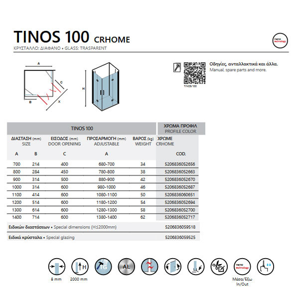 • Η καμπίνα Tinos 100 Chrome διατίθεται και σε άλλες διαστάσεις με επιλογή