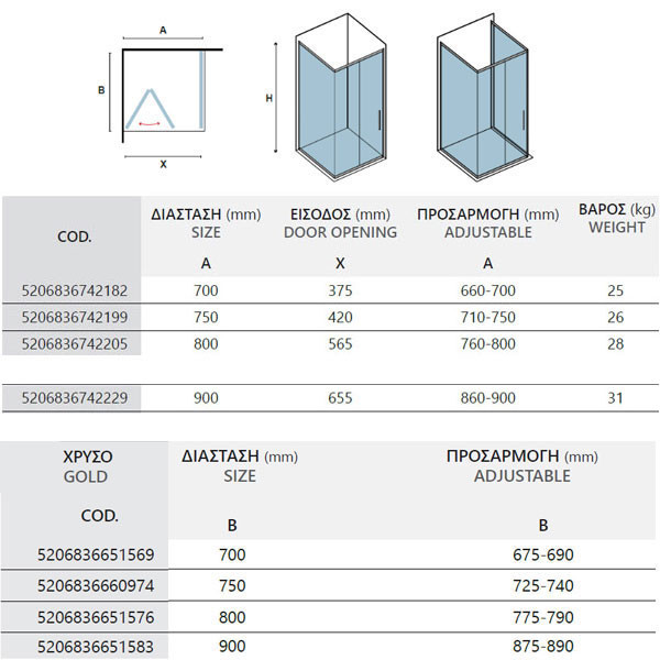 • Τετράγωνη καμπίνα γωνιακής τοποθέτησης βαρέως τύπου, με ένα πτυσσόμενο φύλλο και ένα σταθερό πλαϊνό, σε χρυσό