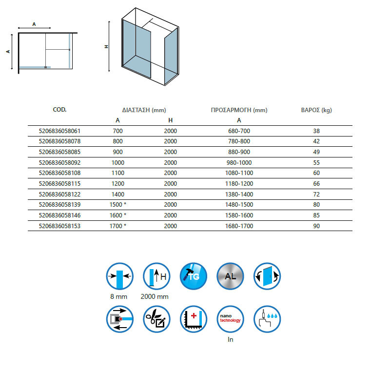 • Διατίθεται με προφίλ ανοδιωμένου αλουμινίου μαύρο ματ και κρύσταλλα διάφανα tempered 8 mm