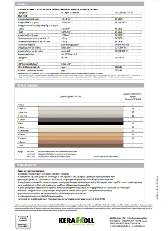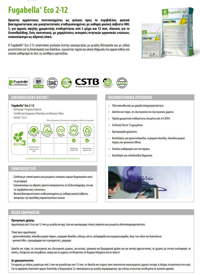 • Το Fugabella® Eco 2 - 12 παρέχει ιδιαίτερα λεπτόκοκκη τελική επιφάνεια με μικρόκοκκους, με επιφανειακή σκληρότητα που δε χαράζεται και αναδεικνύει τα παιχνίδια αντανάκλασης του φωτός, εγγυώντας τη μέγιστη συσχέτιση με τα σχέδια των κεραμικών πλακιδίων, των υαλοψηφίδων και των φυσικών λίθων