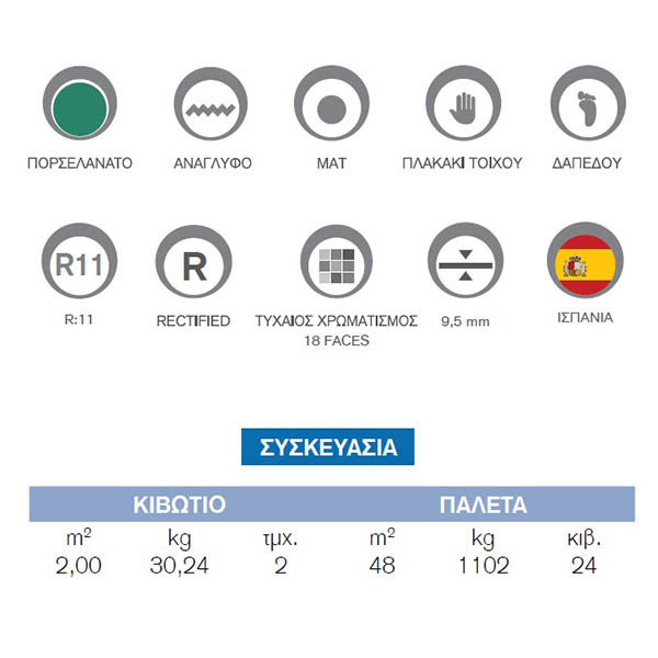• Πλακάκι δαπέδου, πορσελανάτο, rectificado, πολλαπλών τόνων με ματ ανάγλυφη επιφάνεια R11