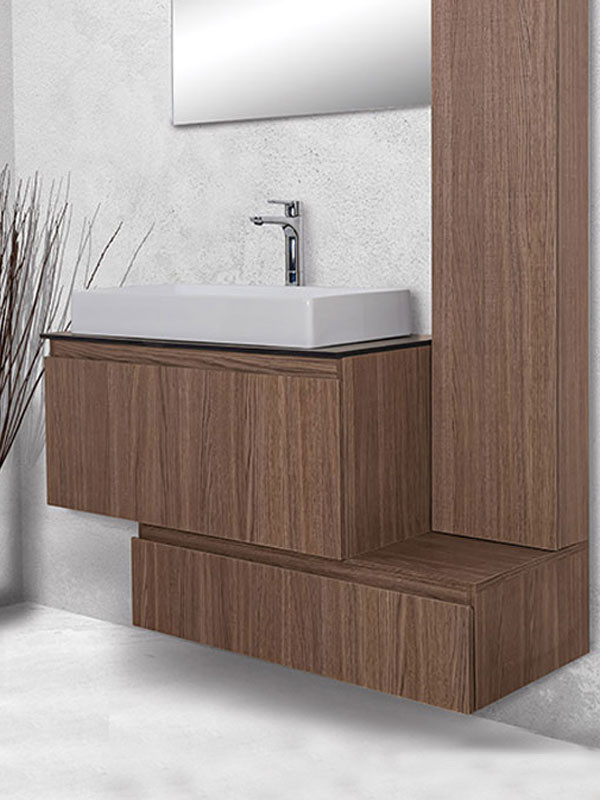 • Βάση κρεμαστή διαιρούμενη: από μελαμίνη χρώματος Σοφαδίτικος No 5, με δύο αποθηκευτικούς χώρους, με δύο συρτάρια