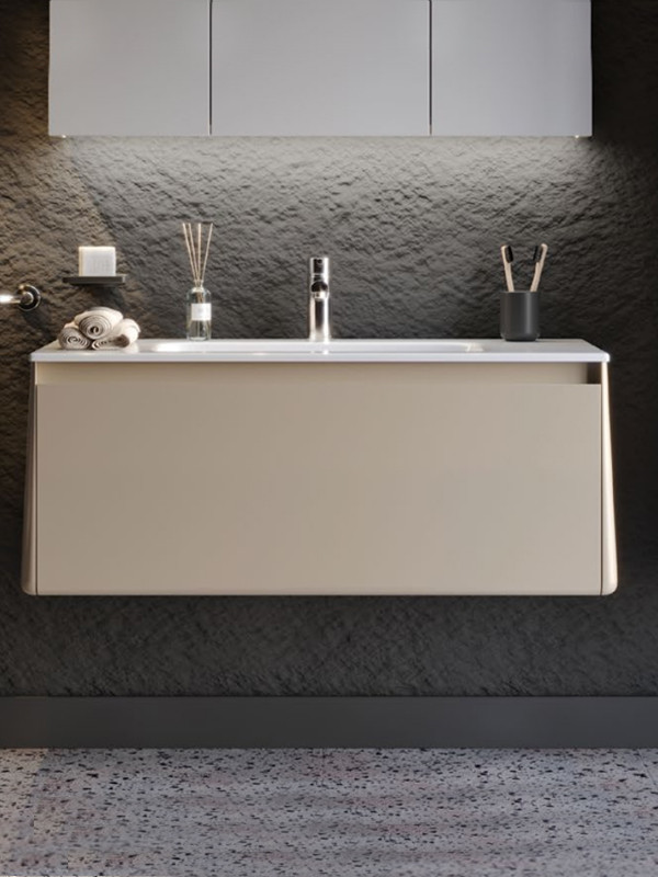 • Βάση κρεμαστή: Από M.D.F. 18mm σε λάκα απαλό Μπεζ Ματ, με ενιαίο αποθηκευτικό χώρο, με μία πόρτα