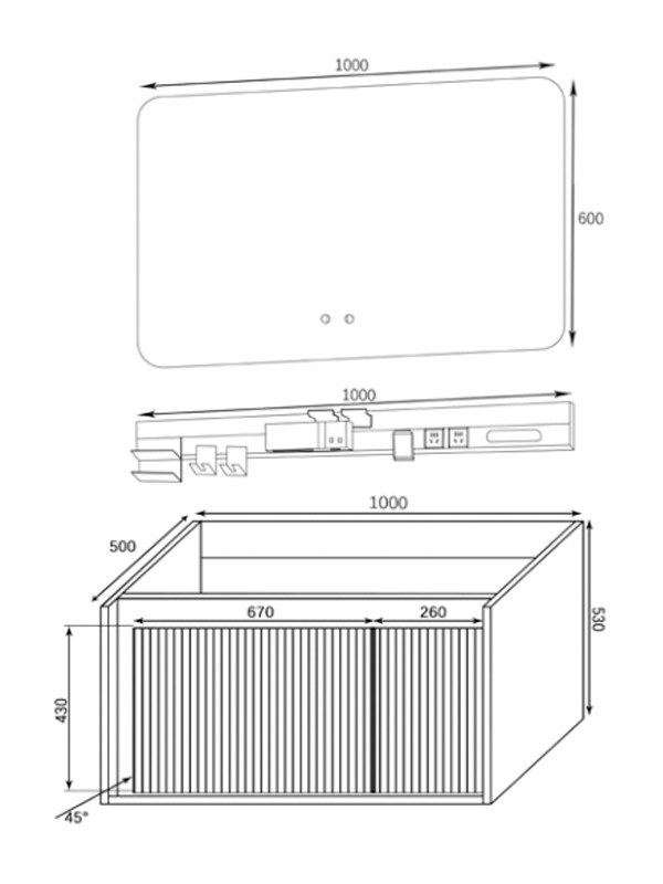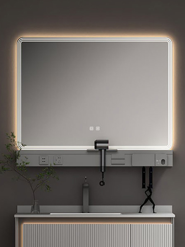 • Καθρέπτης κρεμαστός: Led φωτισμός με αντιθαμβωτική λειτουργία, τρείς επιλογές θερμοκρασίας χρώματος και αυξομείωση έντασης (dimmer). Διαθέτει στο κάτω μέρος υποδοχή για ρεύμα και βάσεις στήριξης για οδοντόβουρτσες, πιστολάκι και είδη προσωπικής υγιεινής