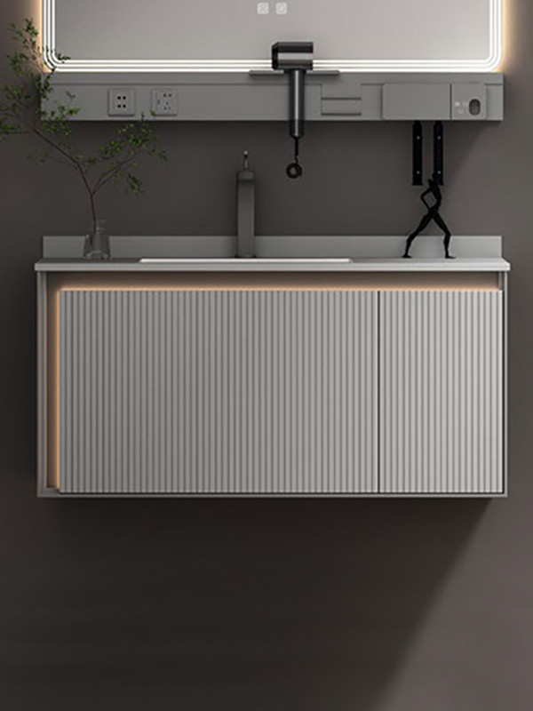 • Βάση κρεμαστή: Aπό κόντρα πλακέ θαλάσσης χρώματος Soft Grey, με δύο αποθηκευτικούς χώρους, με ένα συρτάρι και ένα ντουλάπι