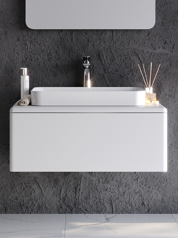• Βάση κρεμαστή: Από M.D.F. 18mm σε λάκα Matte White, με ενιαίο αποθηκευτικό χώρο, με μία πόρτα