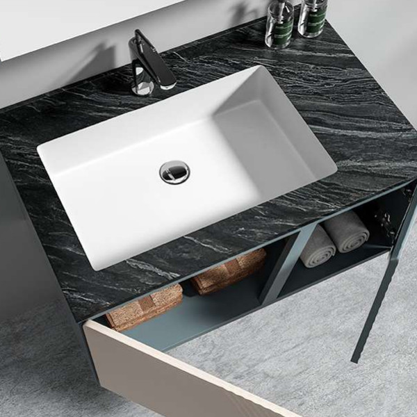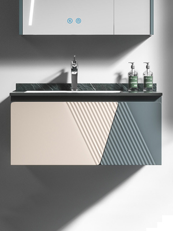 • Βάση κρεμαστή: Aπό κόντρα πλακέ θαλάσσης χρώματος Petrol - Beige, με δύο αποθηκευτικούς χώρους, με ένα συρτάρι και ένα ντουλάπι