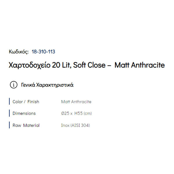 Pam Matt Anthracite 18-310-113 Δοχείο Απορριμμάτων Κουζίνας 20 Lt